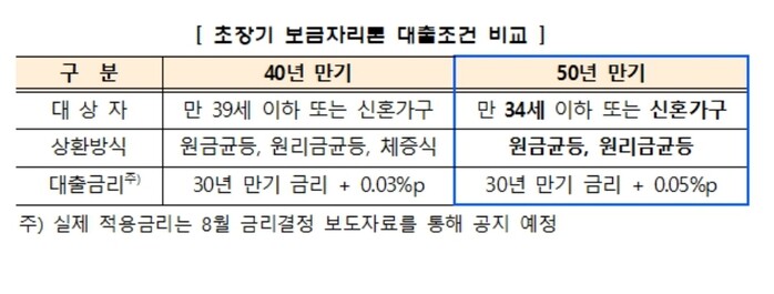 50년 만기 보금자리론과 적격대출은 만 34세 이하 또는 결혼 7년 이내 신혼가구인 경우 이용할 수 있으며, 원금균등·원리금균등방식으로 상환 가능하다.