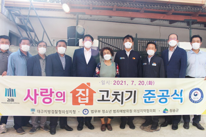 [로컬세계 이창재 기자]대구지방검찰청의성지청(지청장 김상민)과 법무부청소년범죄예방위원 의성지역협의회(회장 권오영)는 청송군(군수 윤경희)과 함께 20일 청송군 청송읍에 소재한 가정의 주거환경 개선을 위한 ‘희망나눔 사랑의 집고치기 20호 준공식’을 가졌다.