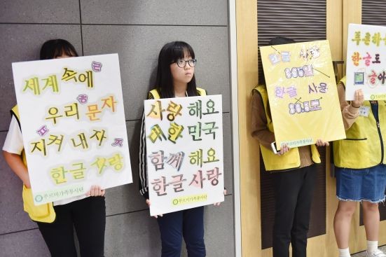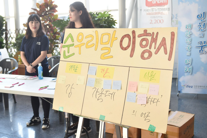 | ▲인천경제자유구역청 로비에서 인하대학교 국어문화원 학생들이 571돌 한글날 기념식을 기리며 가진 우리말 놀이마당 '순우리말 이행시 짓기' 행사를 하고 있다. |