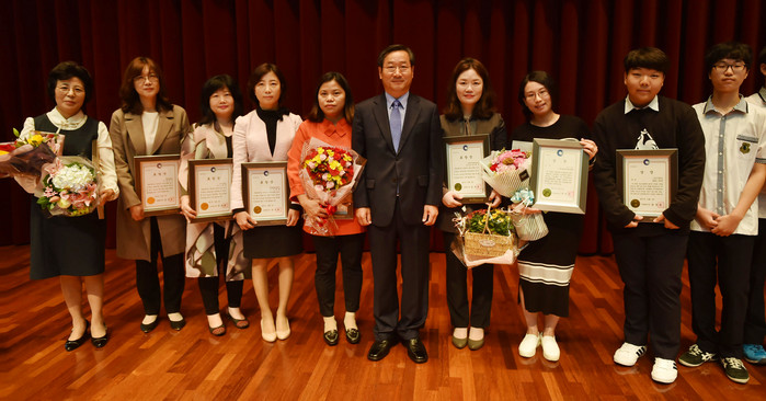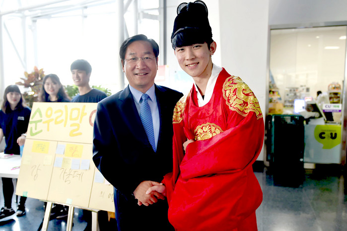 ▲유정복 인천광역시장이 9일 인천경제자유구역청 로비에서 인하대학교 국어문화원 학생들이 571돌 한글날 기념식을 기리며 가진 우리말 놀이마당 '순우리말 이행시 짓기' 행사에서 학생들을 격려하며 기념촬영을 하고 있다. |