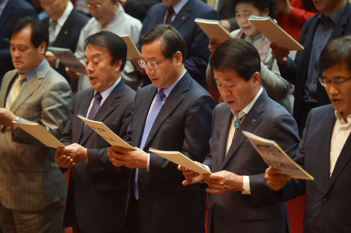 | ▲유정복 인천광역시장이 9일 인천경제자유구역청 대강당 3층에서 열린 '훈민정음 반포 571돌 한글날 기념식'에서 한글날 노래를 제창하고 있다. |