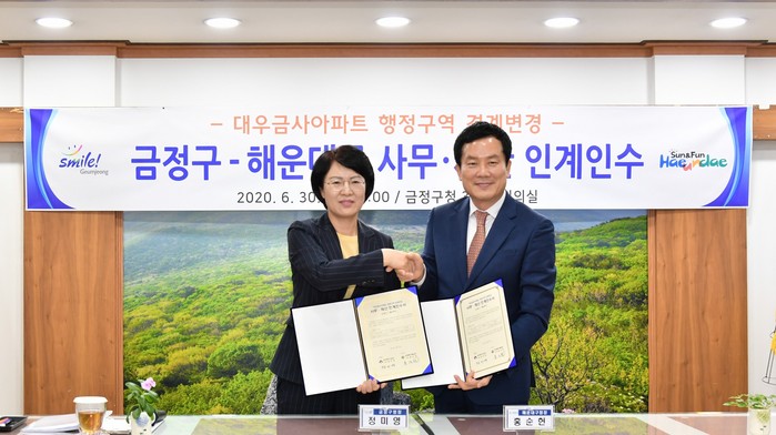 금정구청에서 개최된 인계인수식에는 정미영 금정구청장과 홍순헌 해운대구청장을 비롯한 구 관계 직원들과 대우금사아파트 입주자대표회의 양용남 회장이 참석한 가운데, 행정구역 경계변경으로 금정구에서 해운대구로 이관되는 사무 및 대장 35건에 대한 기관 간 인계인수서를 작성했다.