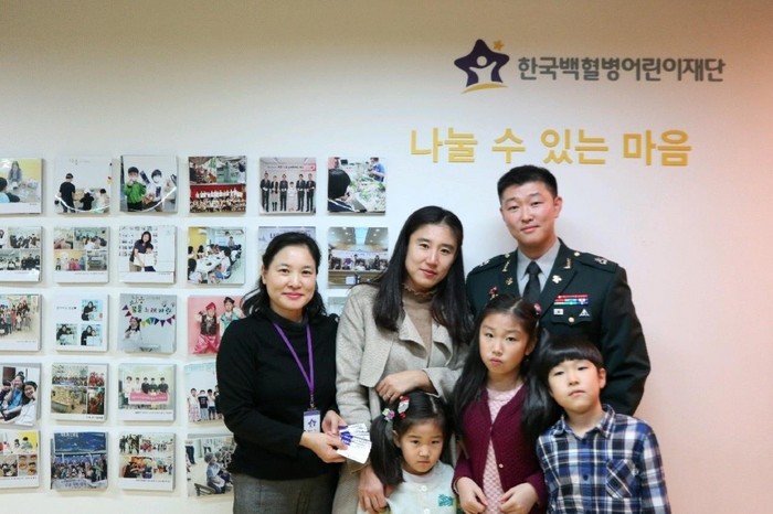 | ▲육군 53사단 코끼리연대 김재엽 소령이 가족들과 함께 한국백혈병어린이재단에 헌혈증서를 기부한 뒤 기념촬영를 하고 있다.(육군53사단 제공) |