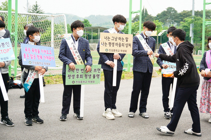 이날 캠페인에는 청송군청소년수련관, 청소년상담복지센터, 진성중학교 또래상담자 및 교사 등 20여명이 참여했다.