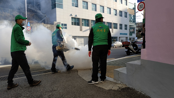 22~23일 확진자가 발생한 좌동, 반여동, 우동의 아파트에서 보건소와 아파트 관리사무소가 합동으로 방역을 실시했다. 또 18개 동 자율방역단과 보건소 합동으로 확진자의 동선을 따라 상가, 다중이용시설 등을 집중 방역하는 한편 관내 전역으로 방역을 확대하고 있다.