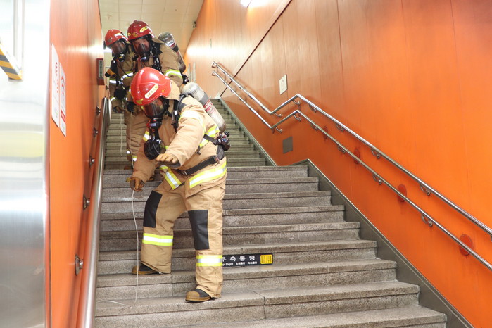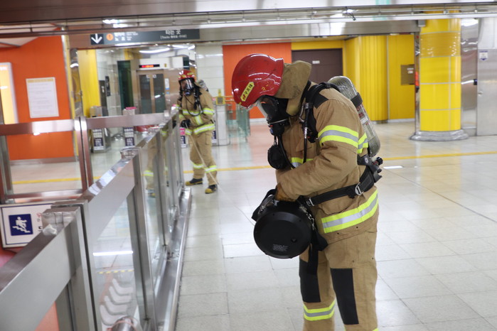 주요내용은 ▲지하역사내 인명구조 동선 및 피난로 확보 ▲스크린도어 개방훈련 ▲무선통신장비점령훈련 ▲철도역사 소방시설 위치확인 등 다양한 방면으로 훈련이 이뤄졌다.