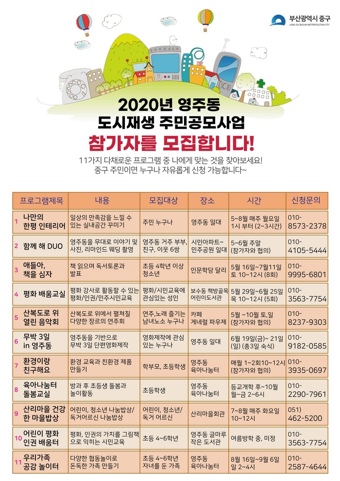 중구 주민이라면 누구나 참여할 수 있으며, 신청 및 기타 자세한 사항은 각 팀별 담당자(포스터 참조)나 영주동 도시재생 현장지원센터로 문의하면 된다.