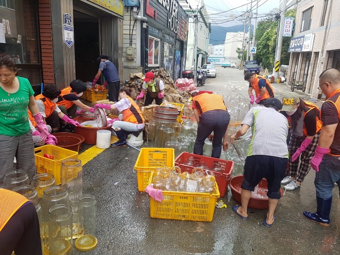 이날 수해복구에 참여한 자원봉사캠프 및 단체, 공무원들은 긴급한 상황에서도 신속하게 현장에 도착하여 가제도구 세척, 토사제거, 물품정리, 쓰레기 처리 등 복구작업을 적극 지원했다.