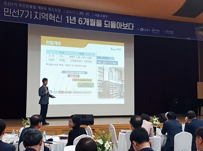 [로컬세계 맹화찬 기자]이성문 연제구청장이 지난 30일 서울 도봉구청 대강당에서 열린 목민관 클럽 제8차 정기포럼에서 전국 자치단체장 24명과 관계공무원 135명이 참석한 가운데 혁신정책에 대한 발표를 했다.