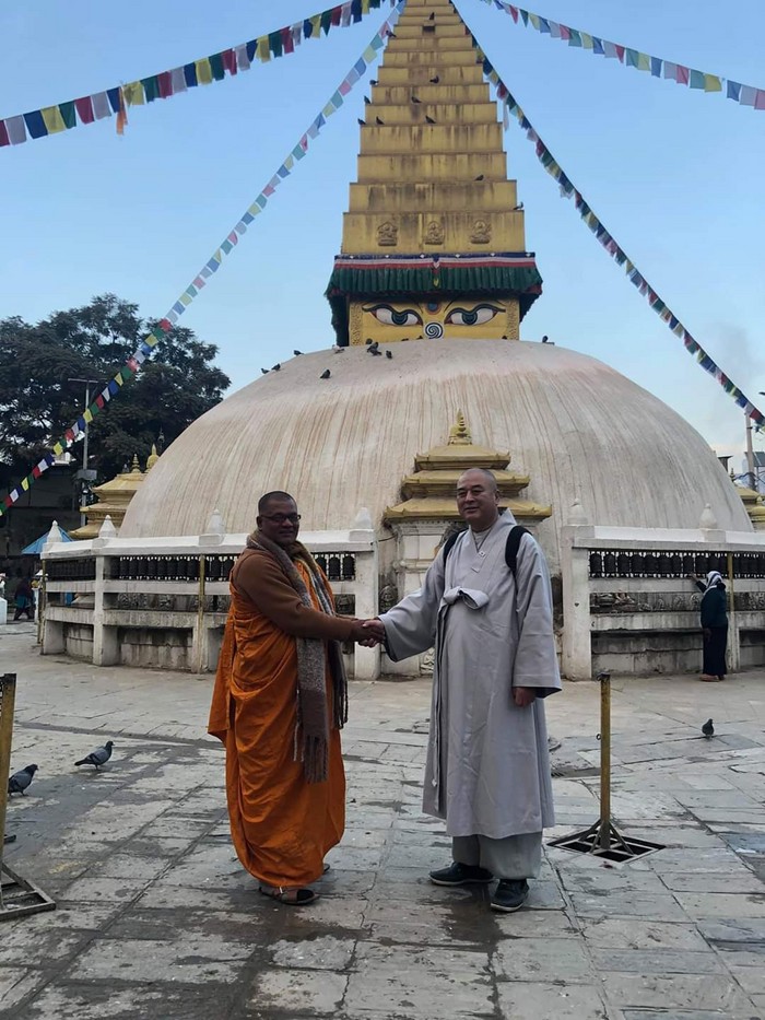 ▲상산스님(왼쪽)이 2020년 새해 법문을 설법하고 들어온 시주금을 샤루마티 부처 비하르 사원의 비쿠 타파시 다르마 테로 스님께 전달하고 악수를 나누고 있다. |