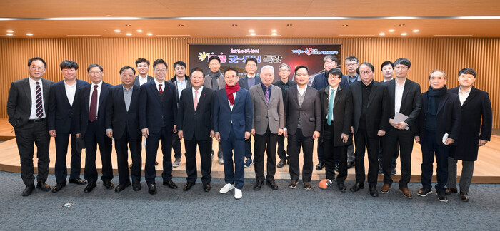 ▲ 우동기 국가균형발전위원장이 3일 경북도청 화공 특강 후 이철우 경북도지사(앞줄의 왼쪽에서 일곱번째)와 임종식 경북교육감(앞줄의 왼쪽에서 다섯번째)등 화공에 참석한 공직자들과 기념촬영을 하고 있다. |
