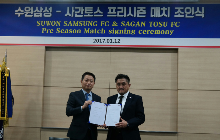 수원삼성축구단 김준식 대표는 사간 토스 다케하라 미노루 대표와 지난 12일 화성에 위치한 수원삼성 클럽하우스에서 사간 토스와 프리시즌 매치 조인식을 가졌다.