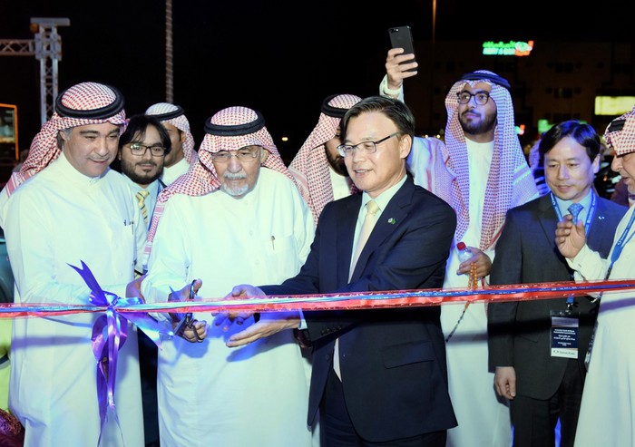 ▲권평오 주 사우디아라비아 대사(가운데 오른쪽), 압둘라 살레흐 알 바자이 오토모티브 경영진이 리야드 대리점 오픈식에서 테이프 컷팅을 하고 있다. |
