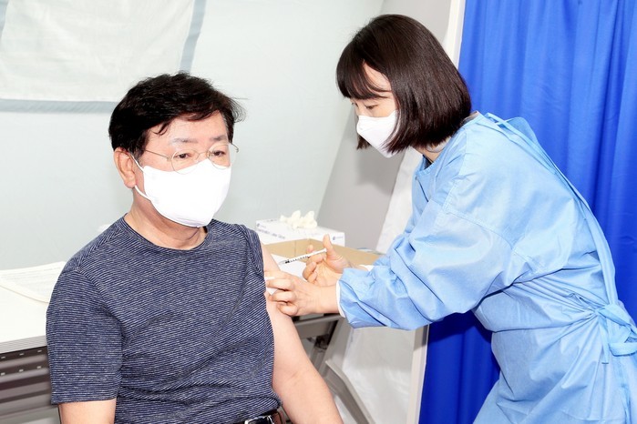▲올해 만68세인 권영세 안동시장이 코로나19 백신을 접종받고 있다. 안동시청 제공 |