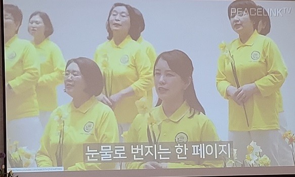▲평화축제 두 번째 문화공연자로 나선 부산지역 다문화가정 여성선교사합창단이 ‘눈물의 역사’를 열창하고 있다. |