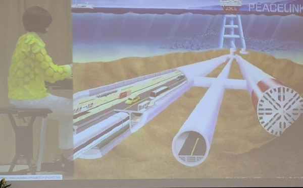 ▲평화축제 첫 번째 문화공연자로 나선 대구지역 다문화가정인 무리 선교사가 엘렉톤(전자오르간의 일종)을 열정적으로 연주하고 있는 가운데, 동북아시아의 평화를 상징하는 구조물이 될 한일해저터널 투시도가 투영되고 있다. |