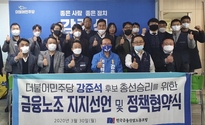 강준석 후보와 금융노조는 금융산업의 공공성 강화와 노동 존중사회 실현이 더불어민주당의 중요한 정책 목표라는 데 뜻을 같이하며, 정책 목표 달성을 위한 이행 과제로 정책협의서를 체결하고, 제21대 국회에서 협약 내용의 실천을 위해 연대하고 협력할 것을 약속했다.
