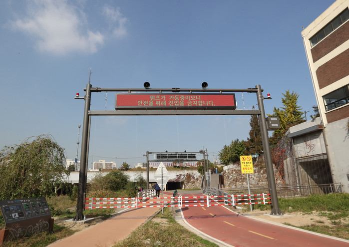 구가 이번에 설치한 재난 예·경보시스템은 ▲통행제한 문구 표출 풀컬러 대형전광판 ▲음성경고 방송 ▲경광등 ▲CCTV ▲통행차단장치 등이 모두 결합된 멀티 예.경보시스템이다. 기존에 음성경보시설만 설치되어 있거나 경보시설 자체가 없는 곳과는 차이가 있다. 또한 자전거 이용자의 속도를 고려한 사전우회경보장치도 추가로 도입했다.