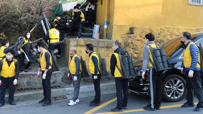 ▲ 부산지방국세청 남녀 직원 50여명이 7일 부산 연제구 연산2동 산동네 일대에서 지게에 연탄을 6장씩 짊어진 채 줄을 서서 나르고 있다. 부산국세청 제공 |