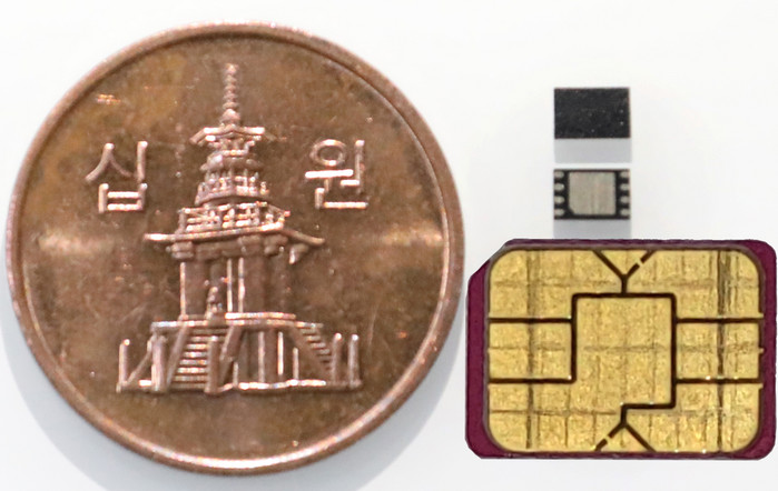 ▲LG유플러스는 ICTK 홀딩스와 함께 ‘물리적 복제 방지기능(PUF)’을 적용한 초소형 내장형 가입자식별모듈(eSIM)을 개발했다고 4일 밝혔다. 사진은 PUF-eSIM(오른쪽 위에서 첫번째와 두번째 칩)과 일반 Nano-USIM, 동전의 크기를 비교한 모습. |