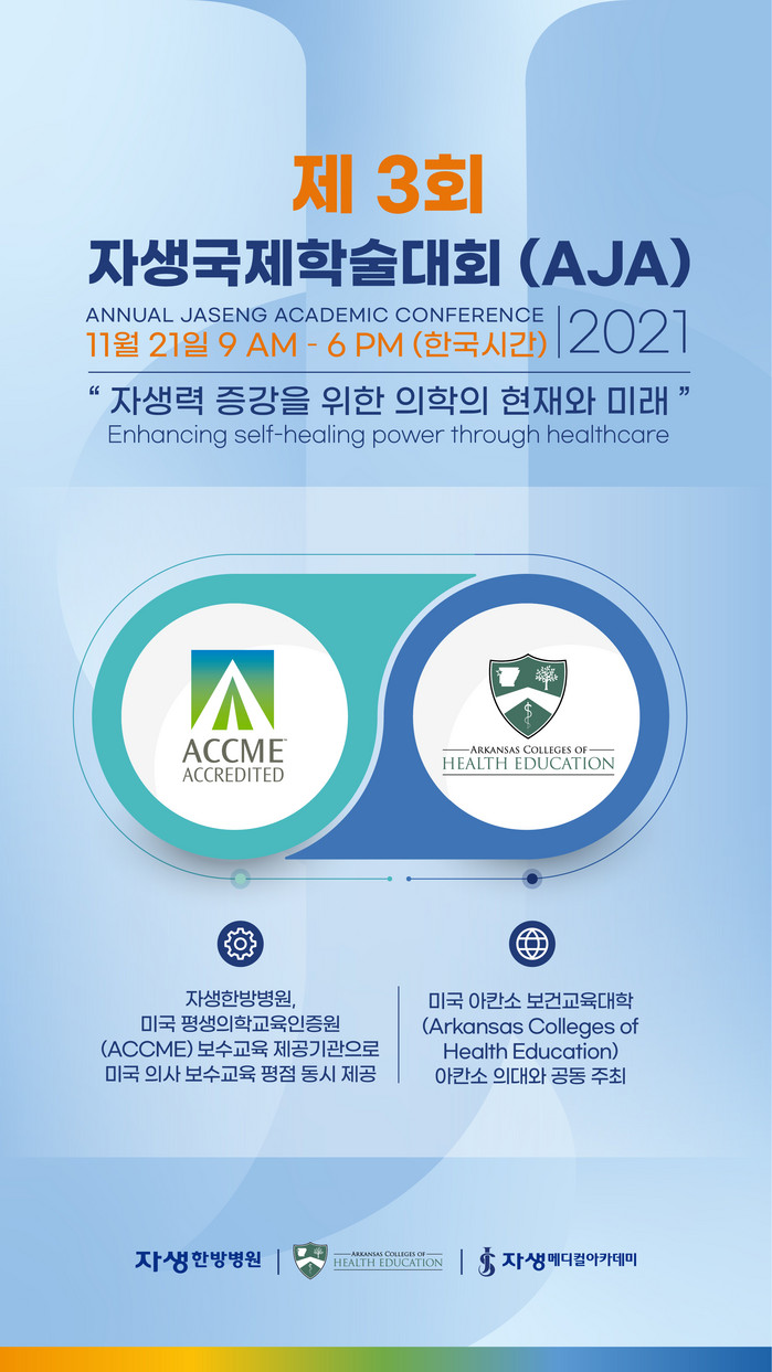 2021 AJA 국제학술대회는 자생한방병원과 미국 아칸소 보건교육대학이 공동 개최하며 온라인 보수교육으로도 운영된다. 대한한의사협회와 미국 침구·동양의학 연방인증위원회(NCCAOM), 캘리포니아 침구위원회(CAB), 호주 중의학위원회(CMBA), 침구중의학위원회(AACMA)의 보수교육으로 평점을 인정 받을 수 있다.