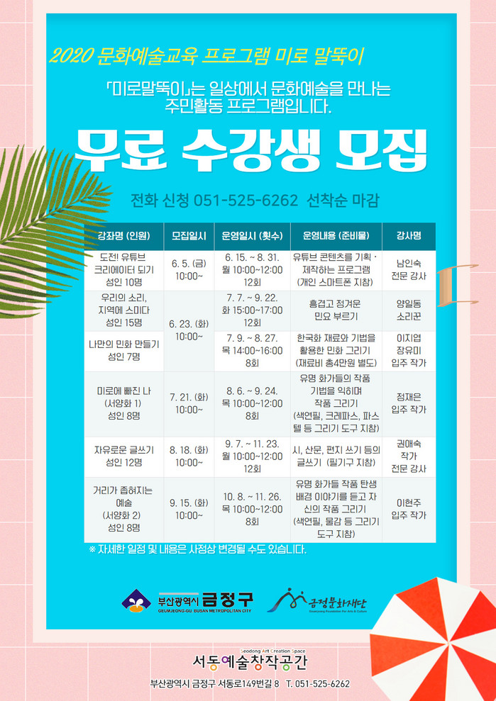 프로그램 참여 신청은 전화로 가능하며, 수강생은 10명으로 선착순 마감된다. 자세한 사항은 금정문화재단 홈페이지에서 확인할 수 있다.