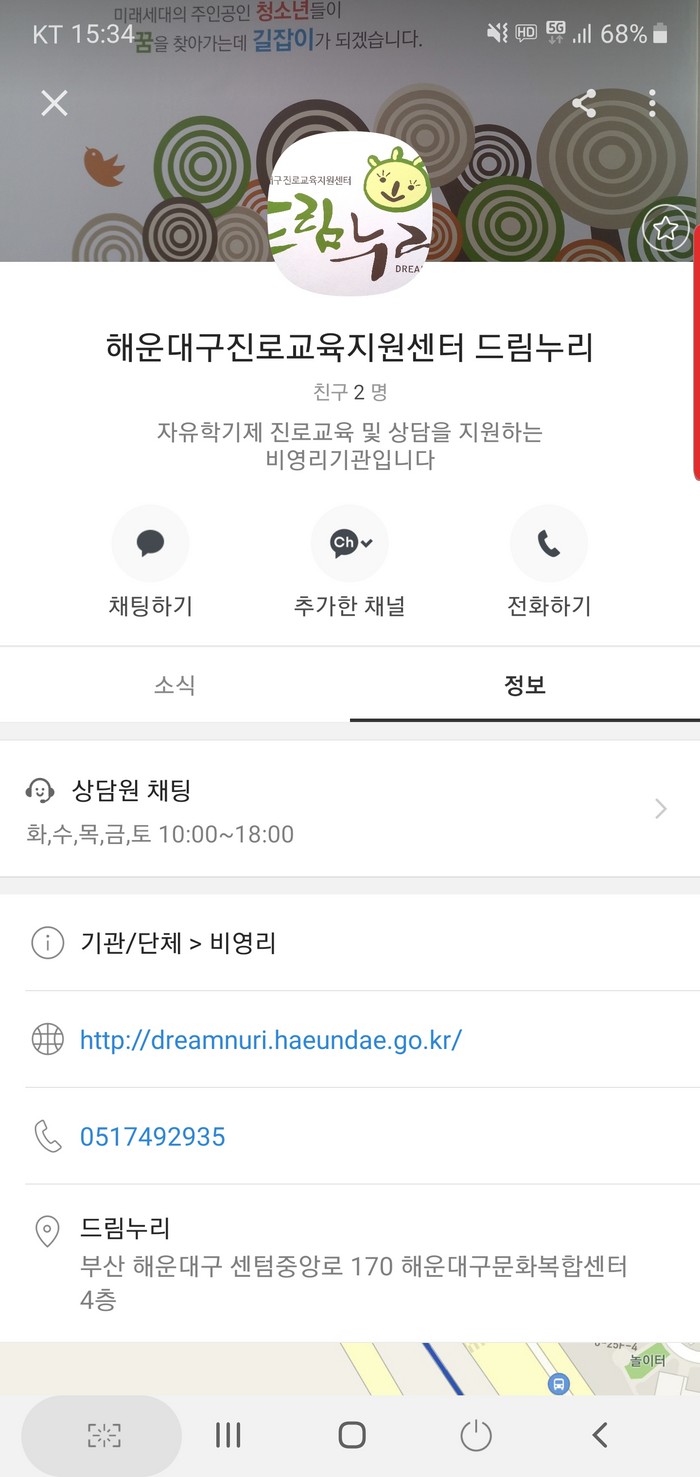 채팅은 카카오톡 ‘해운대구진로교육지원센터 드림누리’ 채널을 추가해 ‘1:1 채팅하기’로 상담하는 방법이다.1차 상담 단계에서는 전화나 채팅을 통해 진로 준비 정도 등을 파악하고, 개인이 휴대폰이나 PC로 온라인 진로검사를 할 수 있도록 인증키를 보내준다.