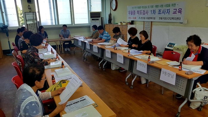 | ▲지난 10일 연제구 연산5동은 연제구정신건강복지센터와 연계해 복지통장 15명을 대상으로 우울증 척도검사 및 치료‧예방 프로그램을 진행했다.(연제구 연산5동 제공.) |