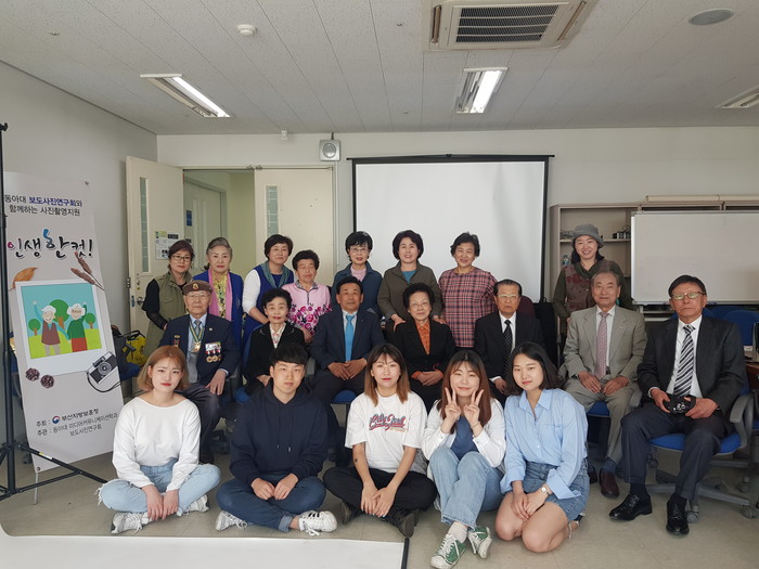| ▲동아대 보도사진연구회와 보훈가족 어르신들이 행사 후 기념찰영을 하고 있다.(부산지방보훈청 제공) |