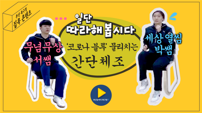 [로컬세계 맹화찬 기자]부산 북구(구청장 정명희)는 북구체육회(회장 오태원)와 함께 지역주민의 건강증진에 도움이 되고자 집에서 할 수 있는 ‘집콕 건강체조’ 영상을 제작·보급한다.