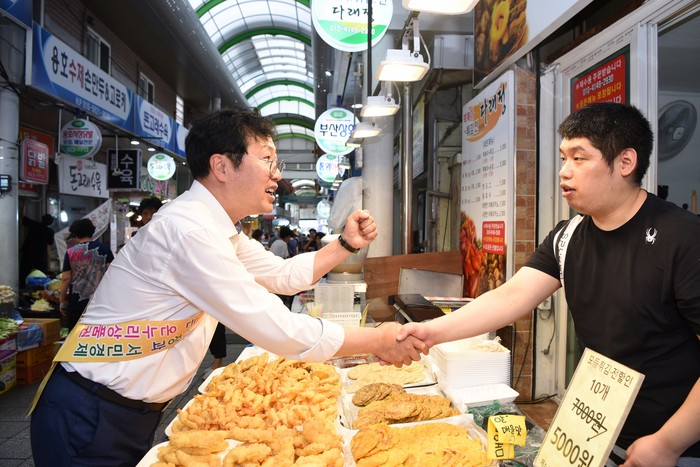 | ▲추석을 맞아 못골 골목시장과용호시장 등 전통시장을 방문해 장보기 행사하는박재범 남구청장 |