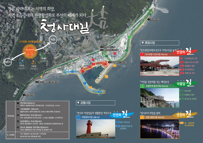 낡은 어항시설을 정비하고, 보행길을 조성해 관광객들이 아름다운 해안경관을 즐길 수 있도록 한다. 야간경관사업과 어항에 수산물 직판장을 만들어 청사포의 신선한 해산물을 관광객들이 손쉽게 즐길 수 있도록 할 계획이다.