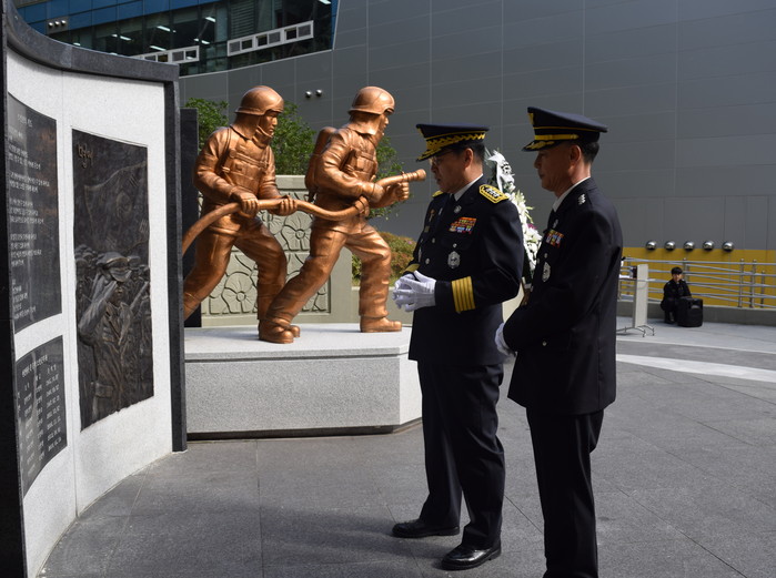 [로컬세계 맹화찬 기자]부산소방재난본부(본부장 변수남)에서는 제57주년 소방의 날을 맞아 지난 7일 순직 소방공무원의 넋을 기리는 추모식을 소방재난본부장이 참석한 가운데 119안전체험관 기념공원에서 거행했다.