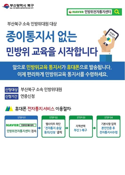 전자통지를 희망하는 북구 소속 민방위 대원은 ‘민방위전자통지센터’에 접속해 기본사항 입력과 본인인증 후 ‘전자통지서 수령’을 클릭하면 된다.
