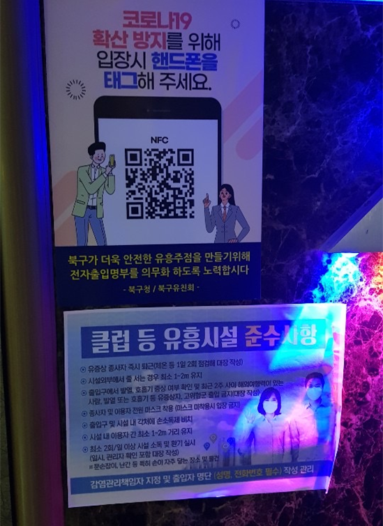 ‘유흥주점 친목회’의 적극적인 홍보 활동 및 영업주의 협조로 관내 모든 유흥주점에 전자출입명부 설치가 완료되었으며, 디지털 약자 및 타인명의 휴대폰 사용자 등을 위해 수기대장 사용도 병행할 수 있다.