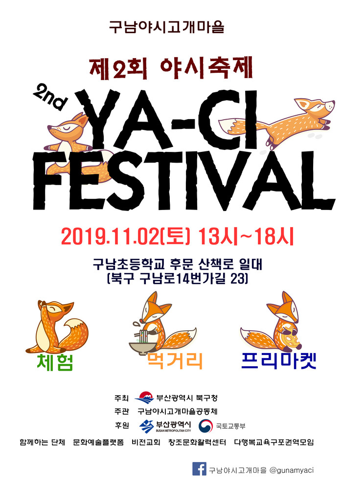 ‘야시축제’는 옛날에 야시(여우)가 자주 나타났다고 해서 ‘야시고개’로 불려온 구남마을을 모티프로 해서 지난해에 처음 기획한 마을축제로 구남야시고개마을공동체가 주관하고 국토교통부, 부산시, 북구청이 후원한다.