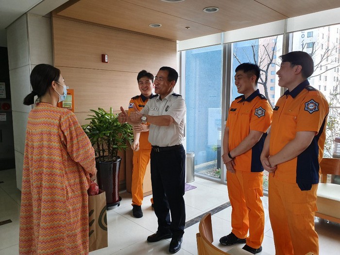 | ▲지난 18일 신평119안전센터 센터장과 심보현(소방교), 김도우(소방사), 김현우(소방사) 구급대원은 병원을 방문해 산모에게 미역 등 출산용품을 전달하고 소중한 생명의 탄생을 축하했다.(부산 사하소방서 제공) |