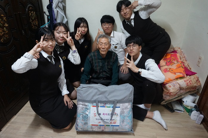 2015년부터 시작된 ‘일일손자 생신축하’는 부산정보관광고 제과제빵 동아리학생들과 이동보훈팀이 독거 보훈 어르신을 찾아 복권기금으로 지원된 이불과 학생들이 직접 만든 케이크를 전달하고 어르신께 생신 축하 인사와 노래를 드리는 위문행사다.