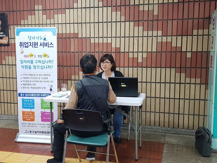 [로컬세계 맹화찬 기자]부산 동구(구청장 최형욱)는 지난 4일부터 오는 10월 4일까지 4개월간 좌천동, 부산진역, 초량동 지하철역 및 주민센터에서 ‘신중년 찾아가는 취업지원 서비스’를 시행하고 있다고 13일 밝혔다.