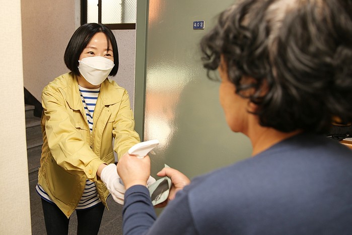 3월에 시행한‘원+원 위생용품 전 세대 배부’ 이후 한 구민이 남겨주신 글로 “2개월 가까이 코로나로 인한 업무 과중에 지쳤을 법한데도 가구마다 캐리어를 끌고 마스크를 배부하면서 환하게 웃으며 전달해주는 직원을 보고 가슴이 뭉클했다”라고 했다.