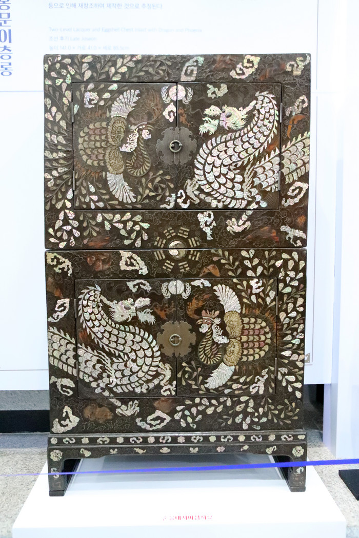 ▲부안청자박물관에서 개막한 '복거부안 부래만복' 특별 기획전시에 진열된 나전난각용봉문이층롱. |