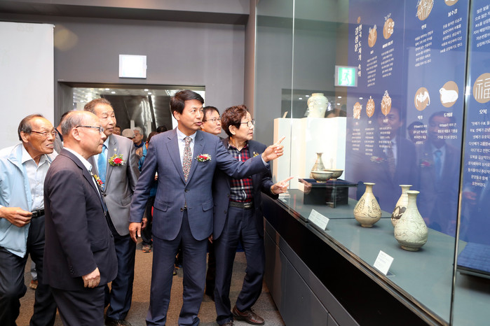 ▲지난 3일 '복거부안 부래만복' 특별 기획전시회가 열리고 있는 부안청자박물관에서 김종규 부안군수(오른쪽에서 두번째)가 진열된 작품들을 둘러보고 있다. |