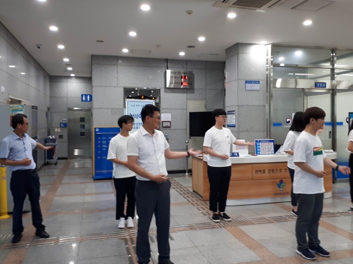 | ▲부산 보훈청 혁신활동 주니어보드 회원들과 부산보훈청 직원들이 청렴친절 체조를 하고 있다. |