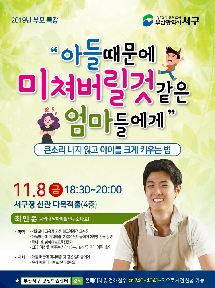 ‘아이 키우기 좋은 딱! 살기 좋은 서구와 함께하는 2019년 부모특강’ 으로 마련된 이번 특강은 “아들 때문에 미쳐버릴 것 같은 엄마들에게 – 큰소리 내지 않고 아이를 크게 키우는 법” 이라는 주제로 진행된다.