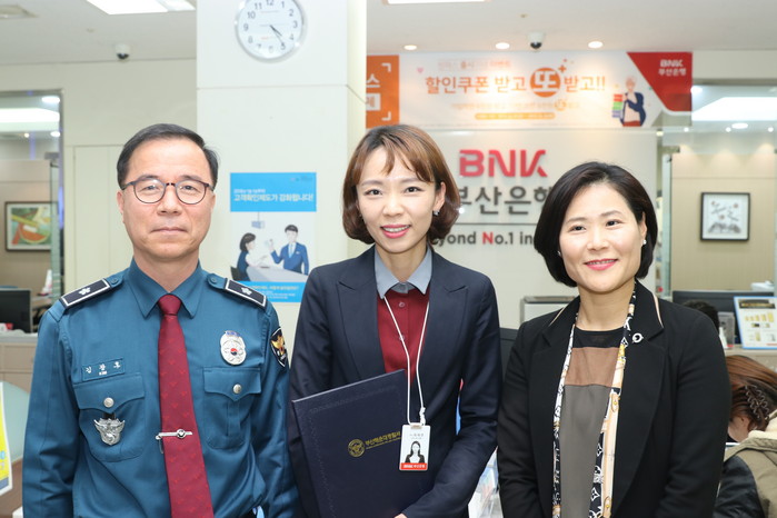이러한 소식을 전해들은 김광호 해운대경찰서장은 은행원 B씨가 있는 은행을 직접 방문해 신고유공 표창장을 전달하고 부산은행 지점장 등에게 전화금융사기 예방에 대한 감사인사와 당부의 말을 전했다.