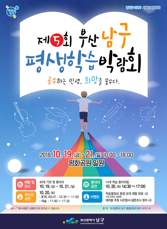 ‘공부하는 인생, 희망을 꿈꾸다’라는 주제로 평생학습을 통한 남구민의 자아실현 희망을 담아 43개 평생학습 프로그램 체험·전시부스 운영과 14개 학습동아리 공연이 펼쳐진다. 남구 관내 초·중학교, 대학교, 민간 평생학습기관과 학습동아리들이 공동 참여할 예정이다.