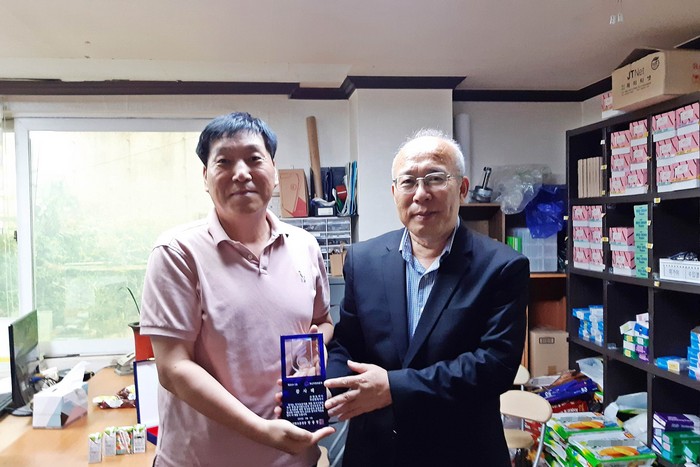 | ▲권율 부산지방보훈청장(오른쪽)은 채재원 크린토피아 부산연제지사 대표에게 감사패 전달. |