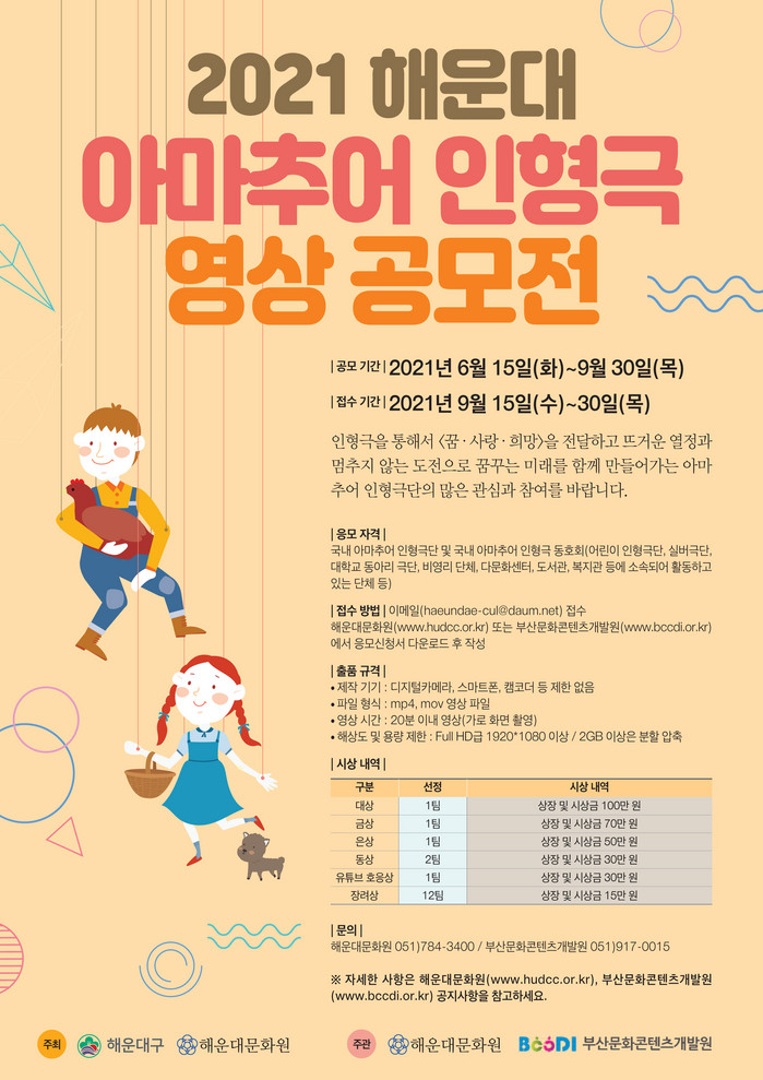 [로컬세계 맹화찬 기자]부산 해운대구, 해운대문화원, 부산문화콘텐츠개발원이 주최ㆍ주관하는 2021해운대 아마추어 인형극 영상공모전을 개최한다.