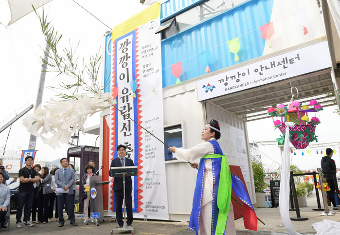 | ▲17일 깡깡이 유람선 출항식에서 (사)동해안별신굿에서 진행하는 전통 뱃고사 의식과 (사)대평동마을회가 준비한 마을잔치 등 선박의 안전 운항 및 마을의 화합을 기원하는 오랜 풍습과 의례를 재현했다.(영도구 제공) |