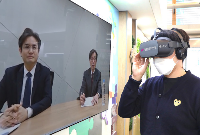 ▲LG유플러스는 VR 교육 전문기업 민트팟과 함께 VR기기를 통해 입시/취업 면접을 연습할 수 있는 ‘U+VR모의면접’을 정식 출시한다. 사진은 LG유플러스 직원이 U+VR모의면접을 통해 면접교육을 받고 있는 모습. |
